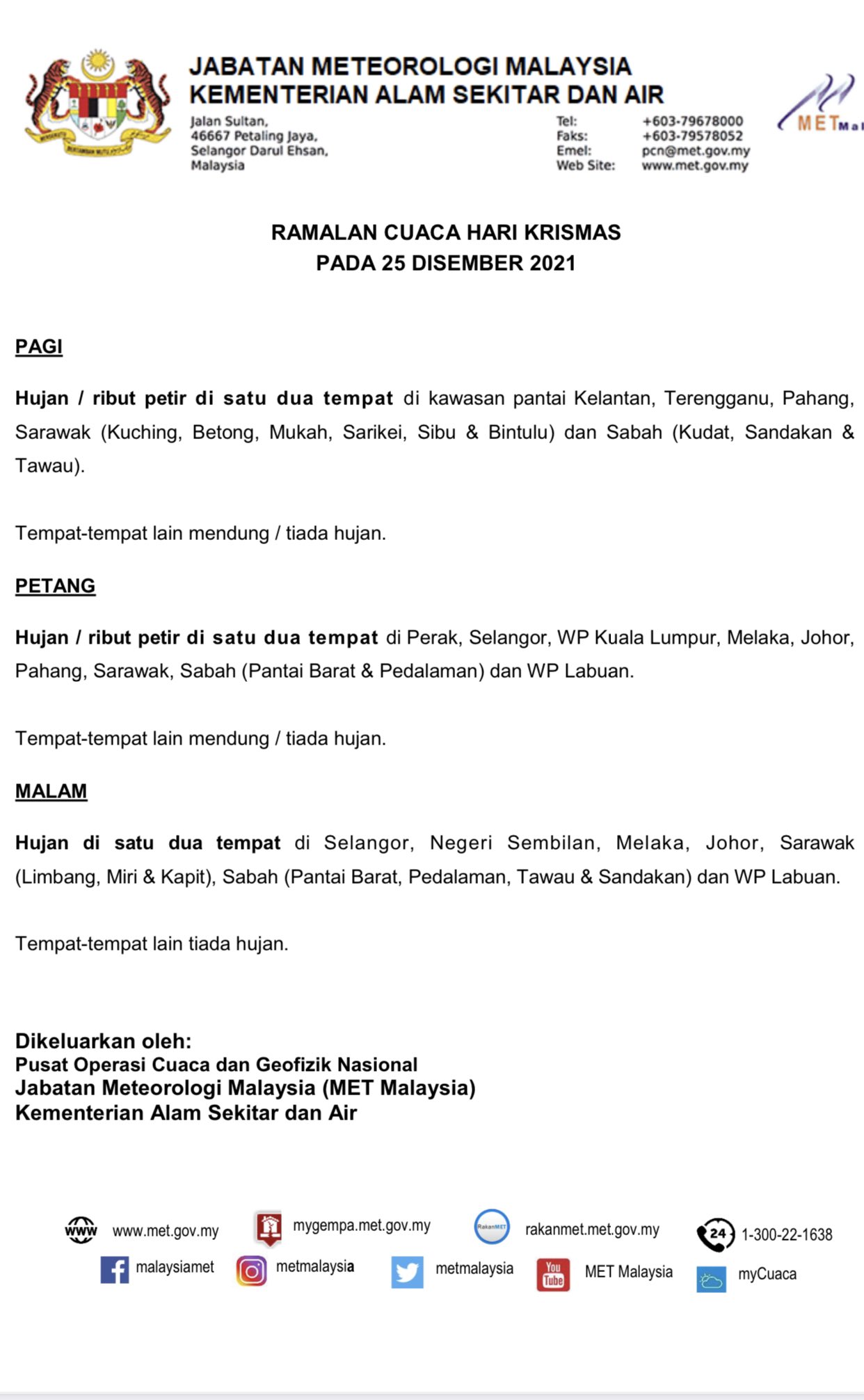 603 79550964 Hotline. Ramalan ini susulan analisis kaji cuaca dikeluarkan oleh MetMalaysia bersama dengan Pusat Ramalan Cuaca Julat Sederhana Eropah ECMWF dan Sistem Ramalan Global GFS yang. Cuaca nasihat dan amaran cuaca buruk.